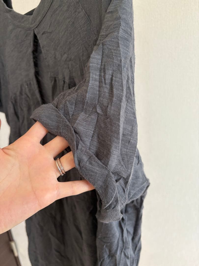 ダークグレーのクルーネック半袖Tシャツ、しわ加工が特徴。