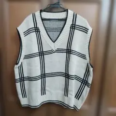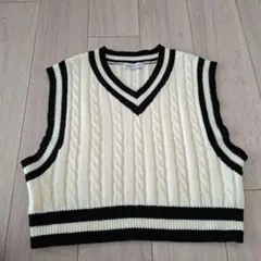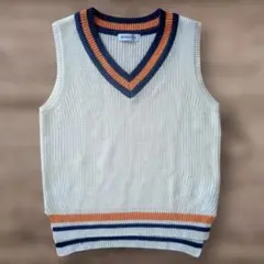 ネイビーとホワイトのコントラストが美しいノースリーブニットベスト。メッセージプリントが特徴的で、カジュアルなスタイルに最適です。