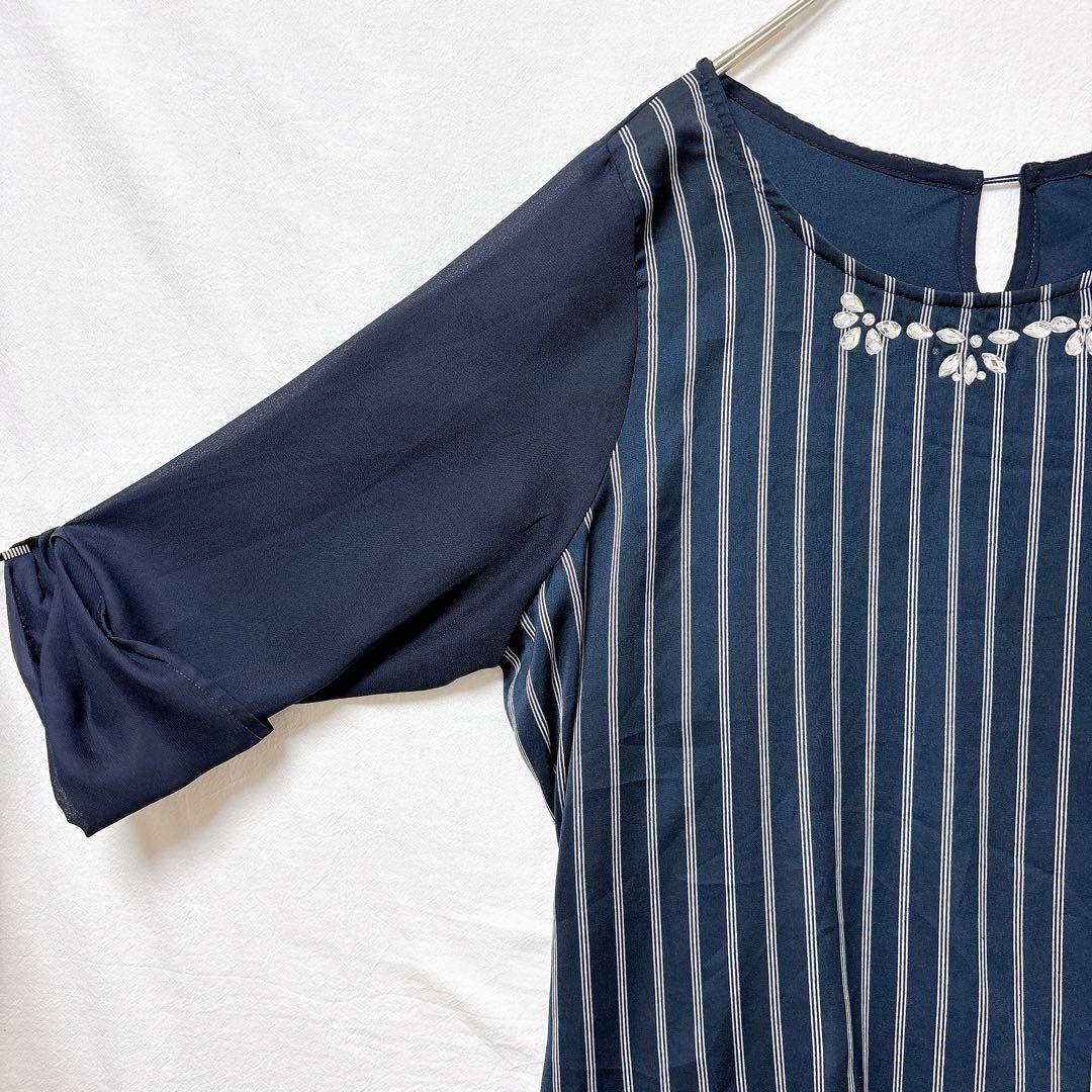 スピンクル◆ブラウス(3L)紺 ビジュー ストライプ フリル 上品 大人可愛い