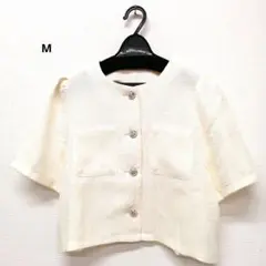 シンプルなデザインのベージュノーカラージャケット、フロントポケット付きで、カジュアルからフォーマルまで幅広く活躍します。