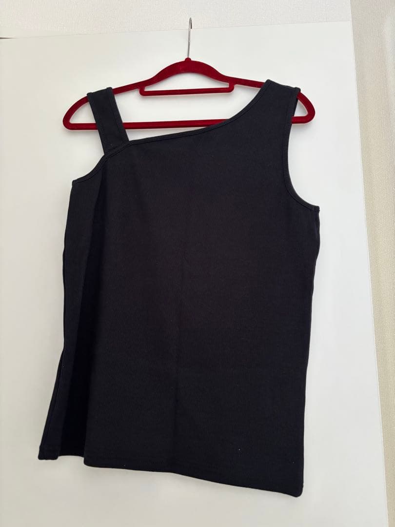 アシンメトリックデザインのブラックタンクトップ、リブ編み素材でスタイリッシュ。
