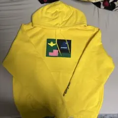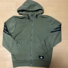 adidasのロゴが施されたパープルのフード付きパーカー。