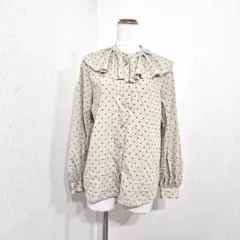 ダークグレーの水玉模様、フリル付きブラウス、サイズS。