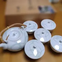 有田焼 春慶作 汲出茶器 亀甲千筋 白磁 茶器揃 急須 湯呑み 5点セット 木箱