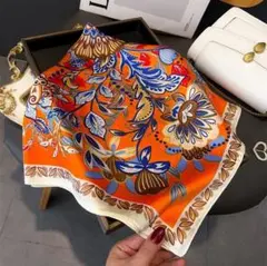 高みえ 大判スカーフ シルク調 正方形 スカーフ ネイビー ホワイト ブラウン