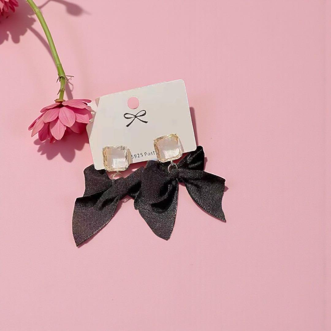 ブラックリボン ピアス クリアストーン 大人可愛い シック シンプル