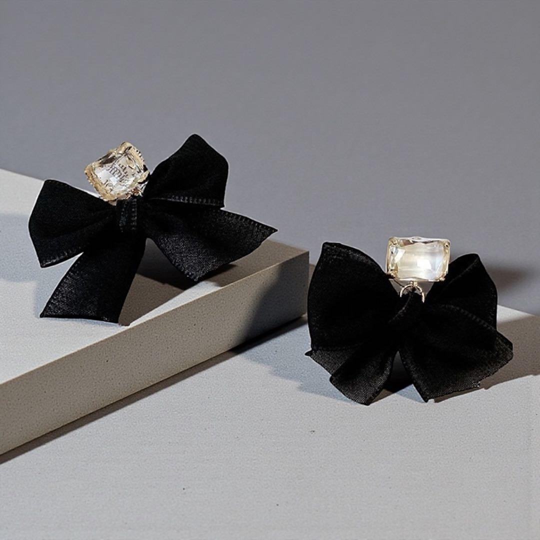 存在感のある大きめのブラックリボンと、クリアストーンが組み合わさった華やかなデザイン。