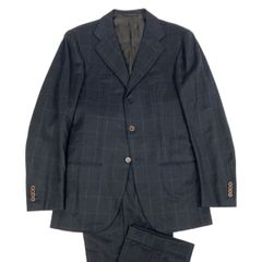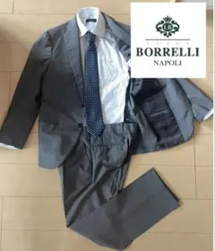 シングルブレストのグレーのビジネススーツ、裏地付きでフロントポケットあり。