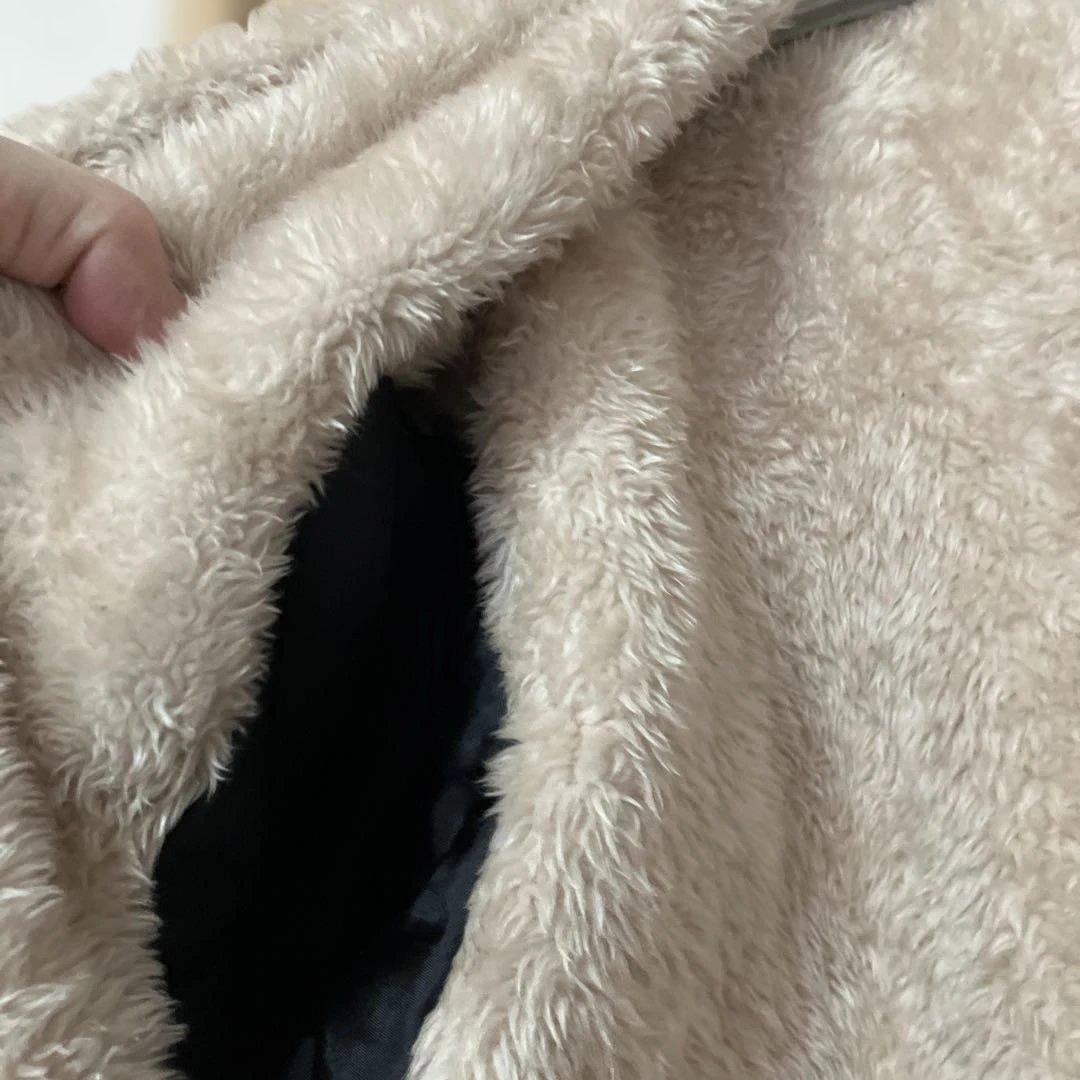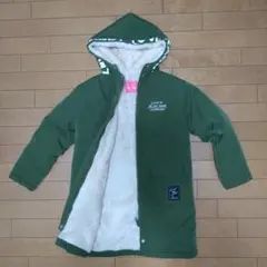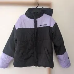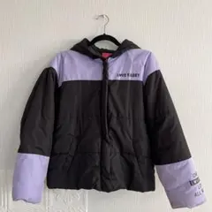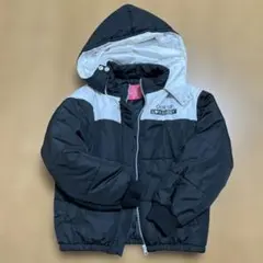 フード付きの黒い中綿コート、前面に2つのポケットと内側にメッセージあり。