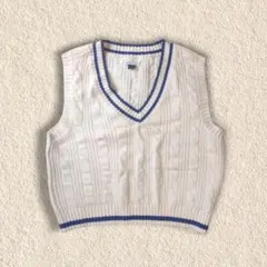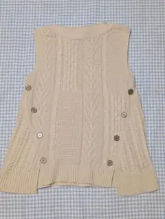 UHGAのニットベスト。ケーブル編みのデザインが特徴的で、クラシカルな雰囲気を演出します。フロントのボタンとポケットがアクセントになり、コーディネートのポイントに。ウール混の素材で暖かく、秋冬のレイヤードスタイルにぴったりの一着です。