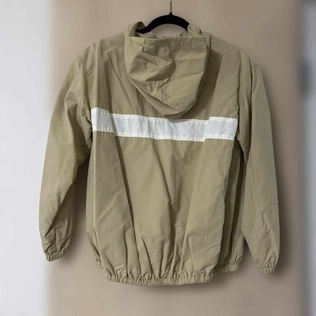 フード付きのベージュジャンパー、ホワイトストライプが特徴的。