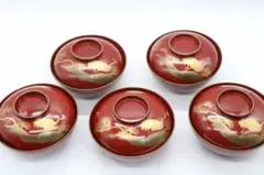 会津塗り汁椀 5客 三代目 惣兵衛 紫らん手画き蒔絵 未使用品