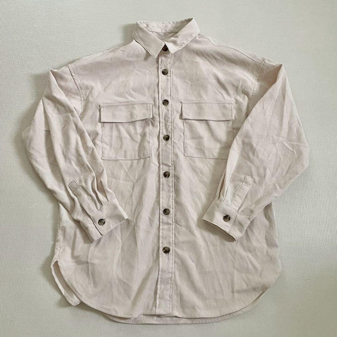 ベージュのシャツとパンツのコーデュロイセットアップ、ボタン付きポケットと長袖デザイン。