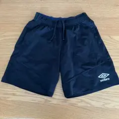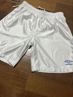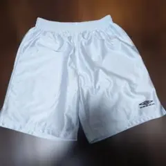 ナイロン素材の青いUmbroハーフパンツ、ウエストゴム仕様で快適なフィット感。