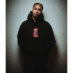 - デザイン: グレーのフーディ、前面と背面にオレンジのグラフィックプリント