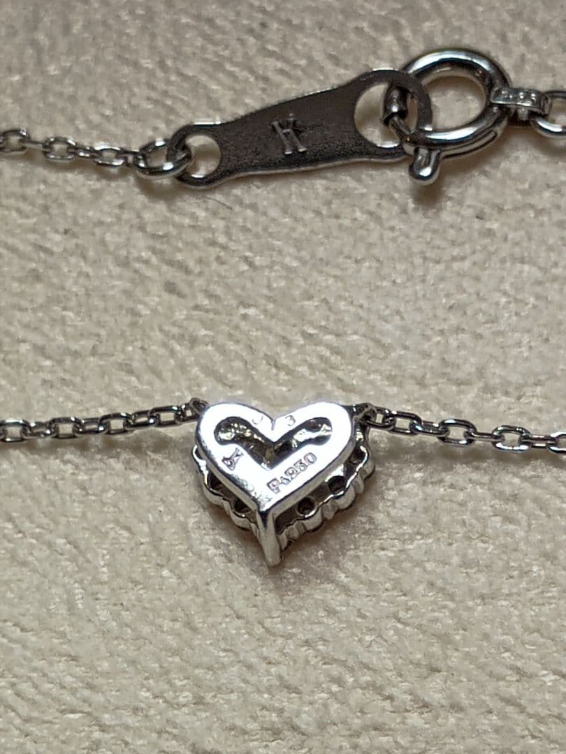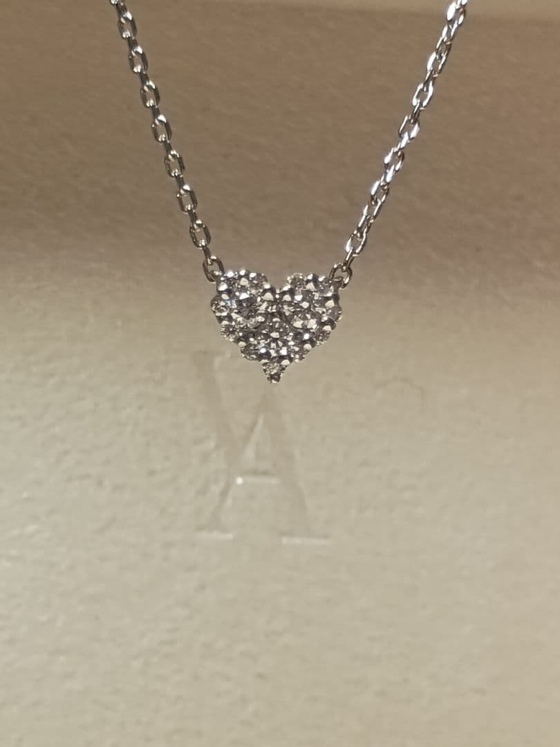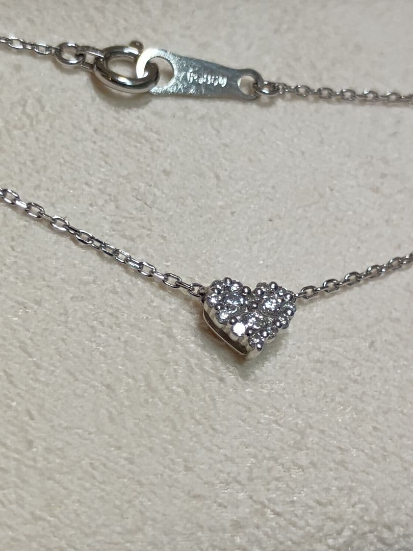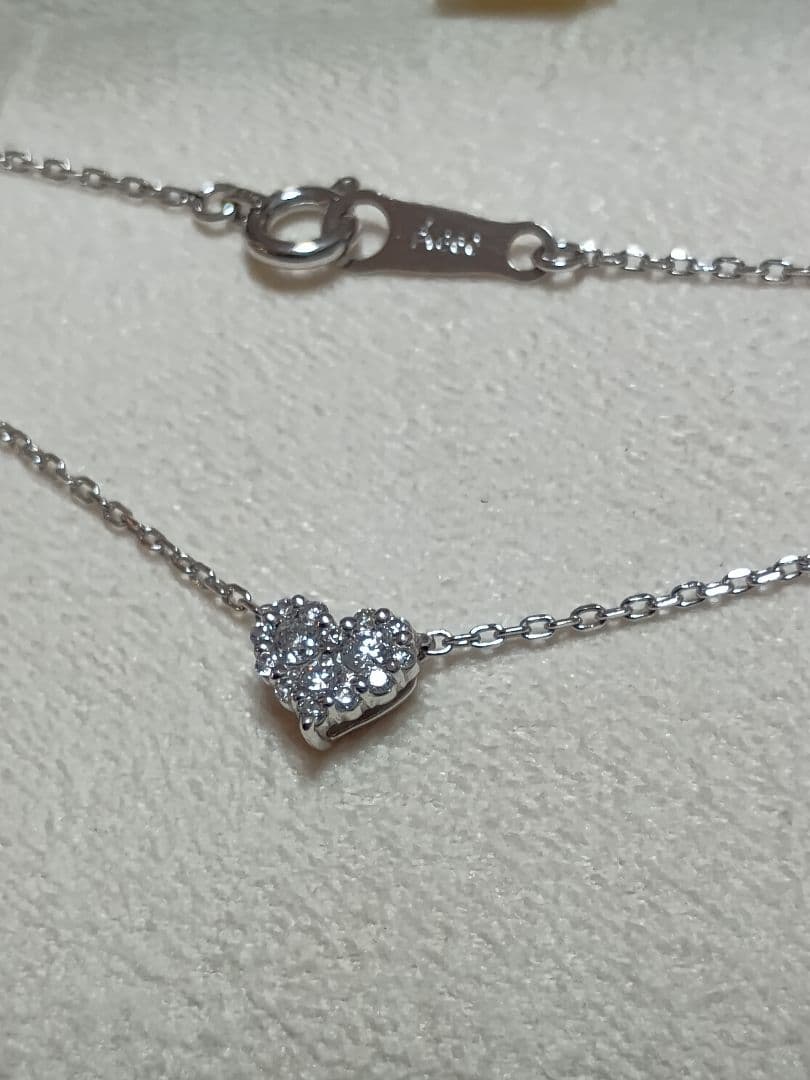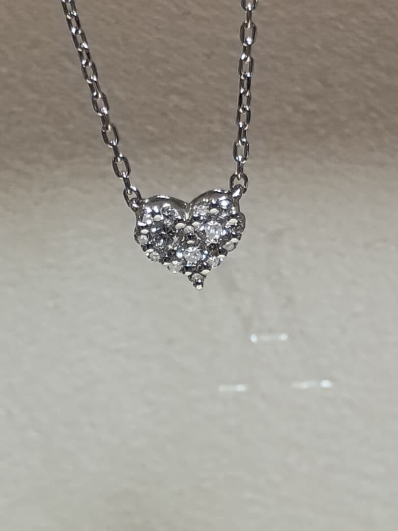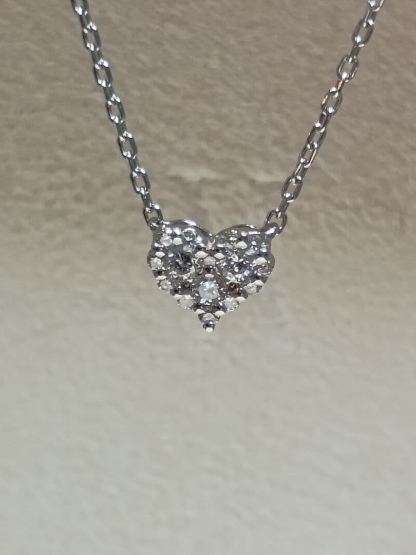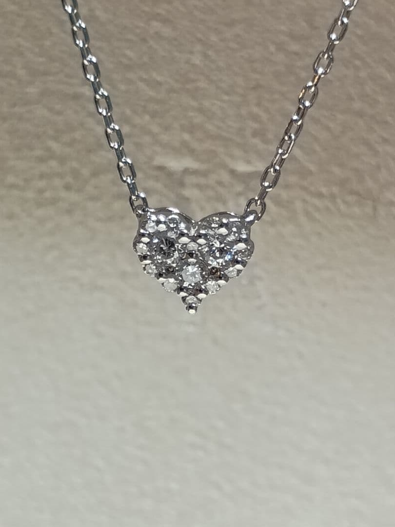 少し大きめの3粒のダイヤモンドの周りに12粒の取巻きダイヤモンドが施された可愛らしいハートフォルム、大きさの違う合計15粒の煌めくダイヤモンドで立体的なデザインに。無垢の象徴のダイヤモンドを配したネックレスは、プレゼントにもおすすめのアイテムです。