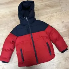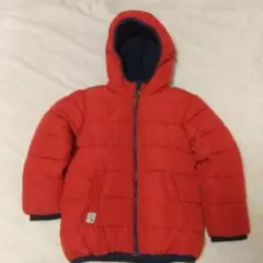 イエローのトラ顔プリントが特徴の中綿コート、5-6歳用。
