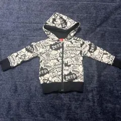 フード付きのホワイトアウター、サイドに黒のストライプデザイン。