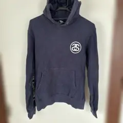 ネイビーのSTUSSYパーカー、フロントにロゴ入り。