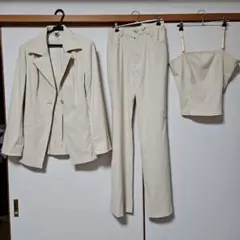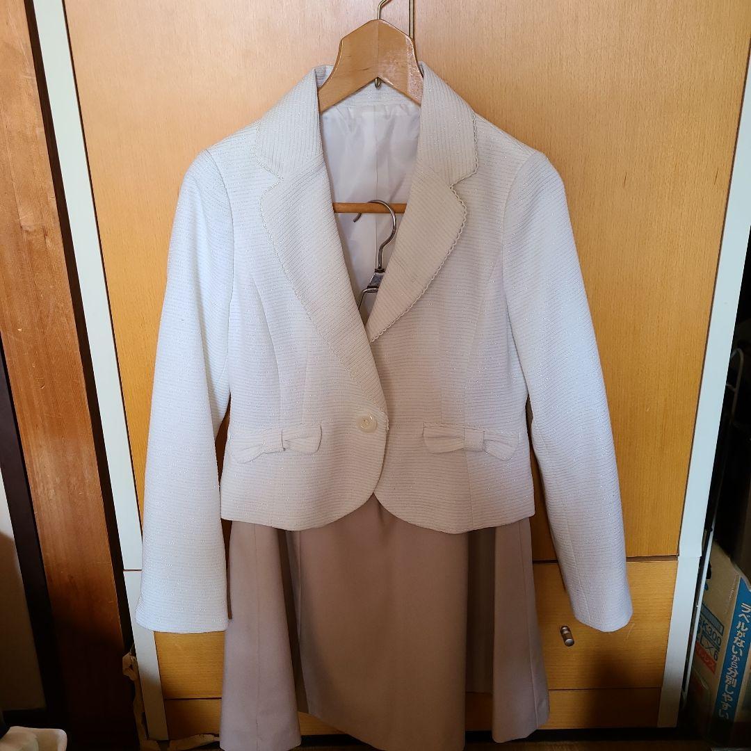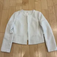 ダブルブレストのホワイトジャケット、リボン付きポケットでエレガントなスタイル。