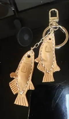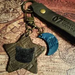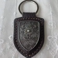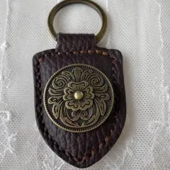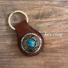 レザーにインディアンヘッドのメダルとターコイズの石が装飾されたハンドメイドキーリングです