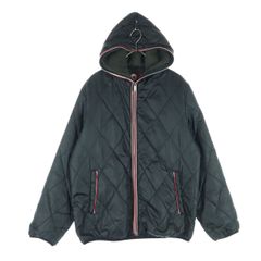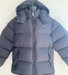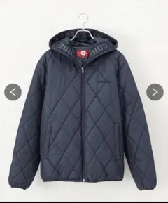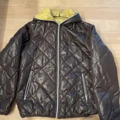 キルティングデザインのブラックダウンジャケット、パープルの内側が特徴。