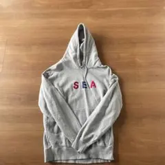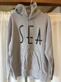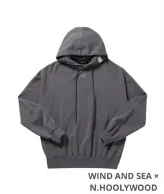フロントにWIND AND SEAのロゴが施されたグレーのフード付きパーカー。