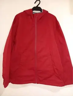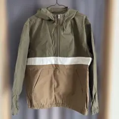 フード付きのベージュマウンテンパーカー、ポリエステル100%で軽量。