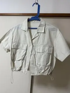 フリル付きの襟が特徴のベージュのリブ編みTシャツ、Mサイズ。
