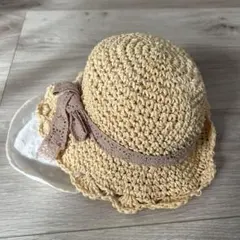 車の柄のリボンが特徴的なベージュの麦わら帽子で首の日焼け防止がついています。