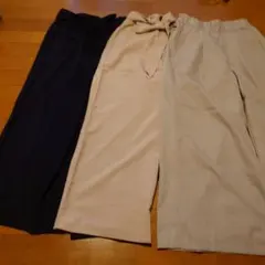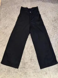 ストレートシルエットのブラックパンツ、ゴムウエストで快適な着用感。