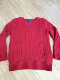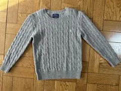 グレーのケーブルニットセーター、POLOのポニーロゴ付き。