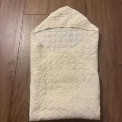 クマの耳付きフードとストライプ柄のかわいいおくるみ。