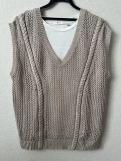 ニットベスト ケーブルニット ベスト レース編み ボタン付き ワインレッド