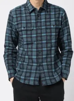 ネイビーとホワイトのチェック柄の長袖ネルシャツ、カジュアルスタイルに最適。オーバーサイズというよりか細身でスタイリッシュに着れるサイズ感です。