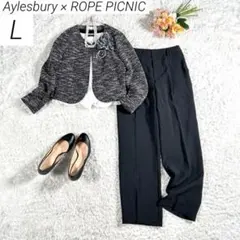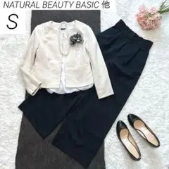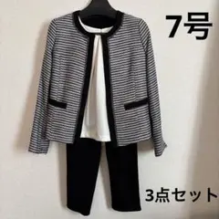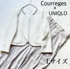 ノーカラーのグレー系ツイードジャケットとネイビーのテーパードパンツのセットアップ。