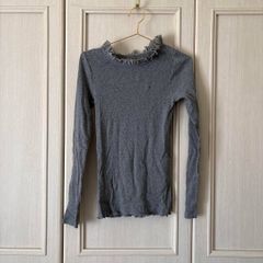 ブラックのハイネックシャツ、フリル裾とピンタックが特徴。