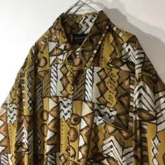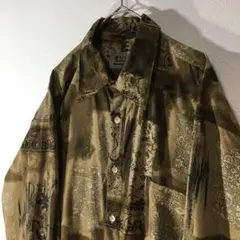 ☆幾何学模様と古代ローマ風のモチーフが組み合わさった総柄デザインが特徴の日本製シャツ。ダークネイビーをベースにグレー〜ホワイトの濃淡で構成されたグラフィカルなプリントが目を惹く一枚。ゆとりのある4Lサイズで、シルエットに抜け感があり、羽織りとしても活躍。さらりとしたポリエステル生地で軽やかに着られ、90sの雰囲気を残しつつモードにもストリートにも馴染むアイテムです。