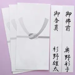 - デザイン: 白と黒のストライプの不祝儀袋と紫色の不祝儀帛紗のセット