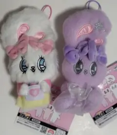 ふわふわの紫色キャラクターぬいぐるみ、リボン付きで可愛らしいデザイン。