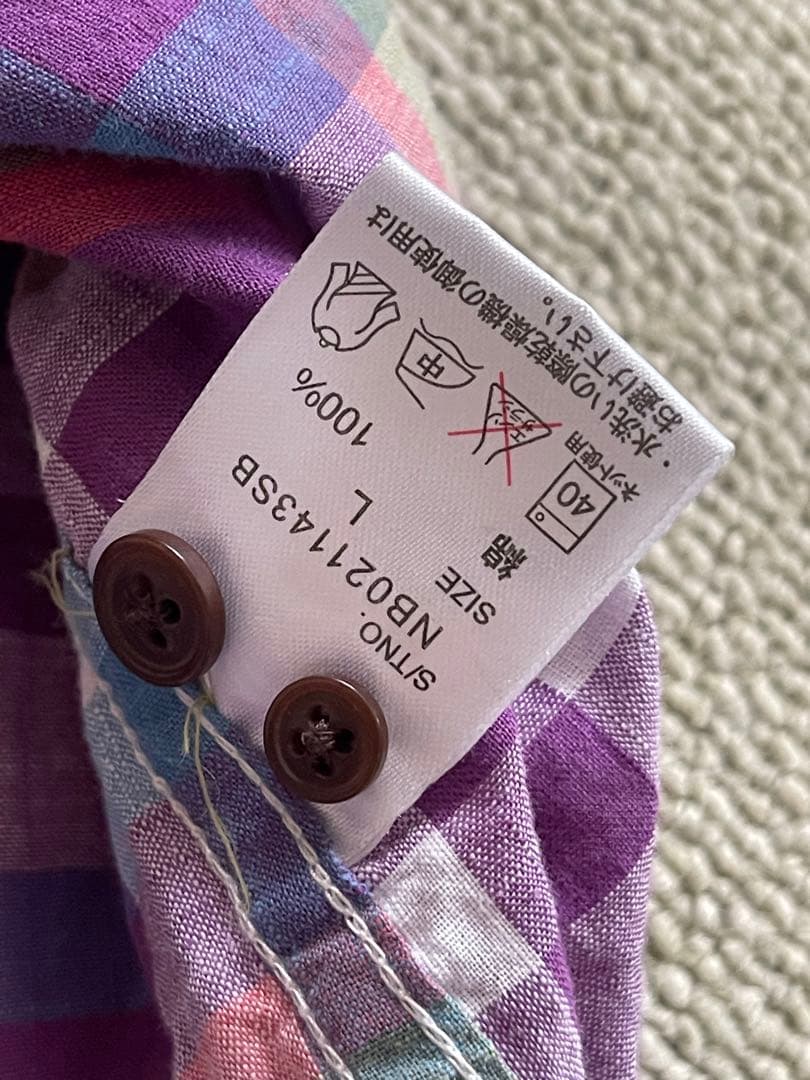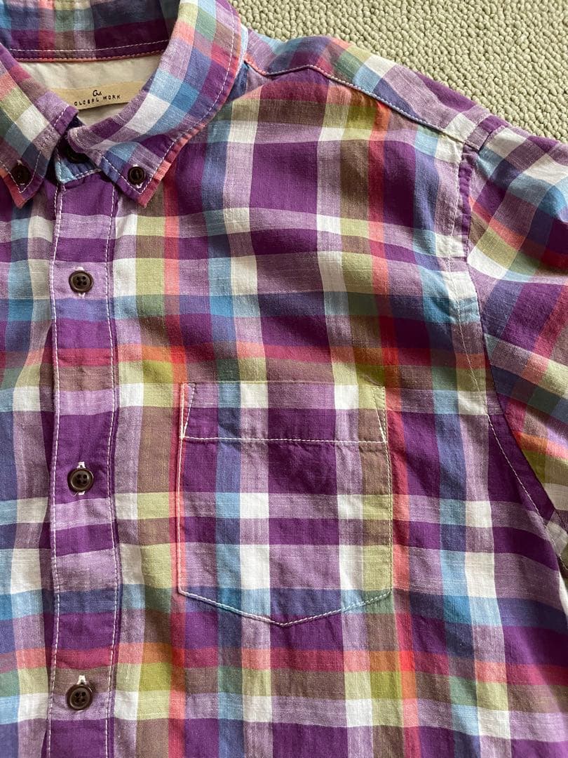 グローバルワークの半袖ワイシャツです。紫色ベースのチェック柄、Lサイズです。着用回数少ないです。左胸にポケット付いています。
