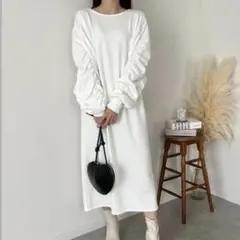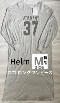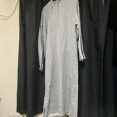 グレーのプリント入りロングカットソーワンピース、長袖デザイン。