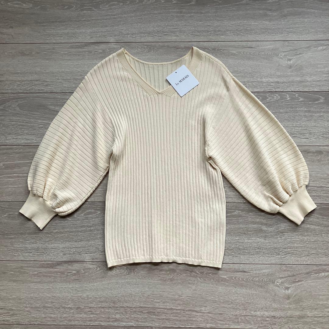 リブ編みのクリーム色Vネックセーター、バルーンスリーブデザイン。