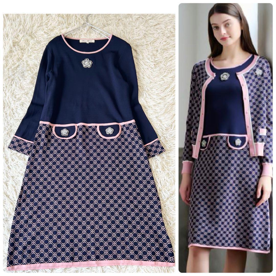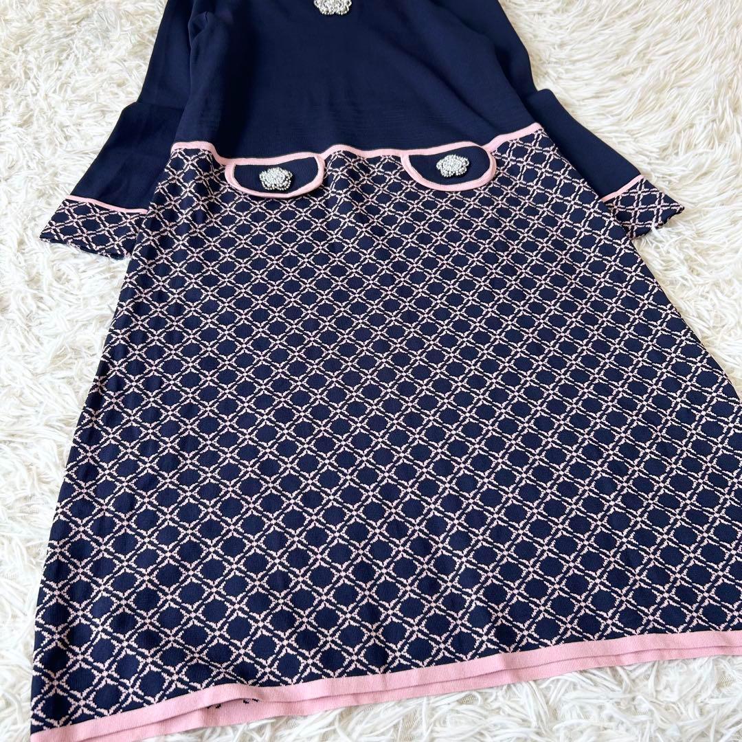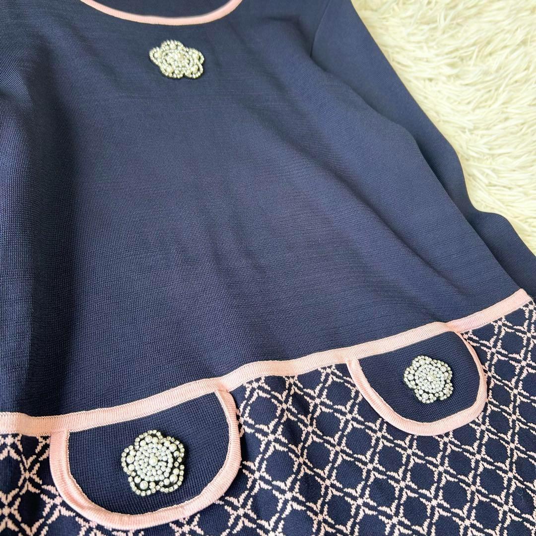 スーパービューティー Super Beauty Ohra Beau ジャガード編み ビジュー 切り替えワンピース 紺 ピンク