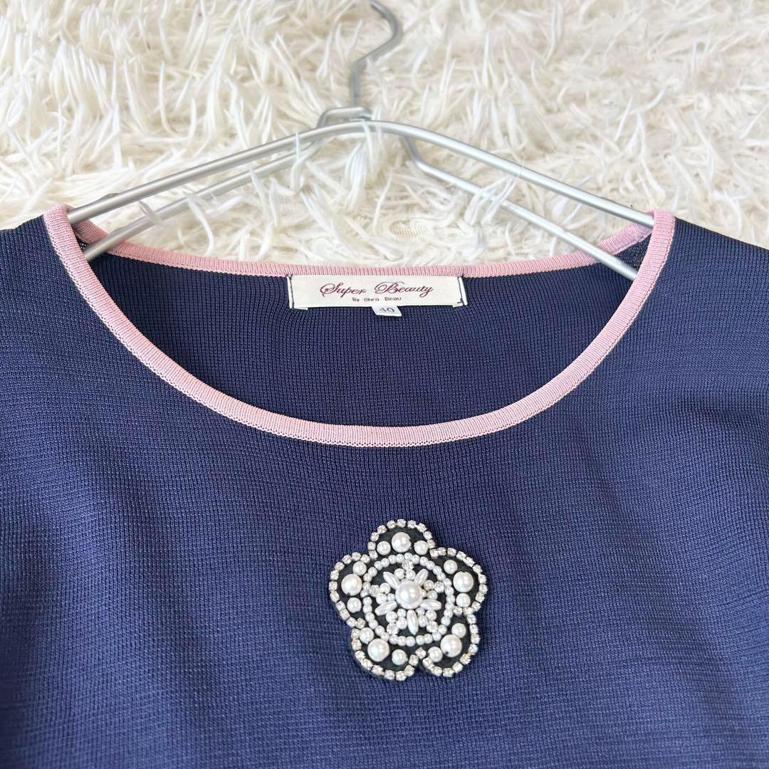 美品 スーパービューティー ビジュー 切り替えワンピース 紺 ピンク