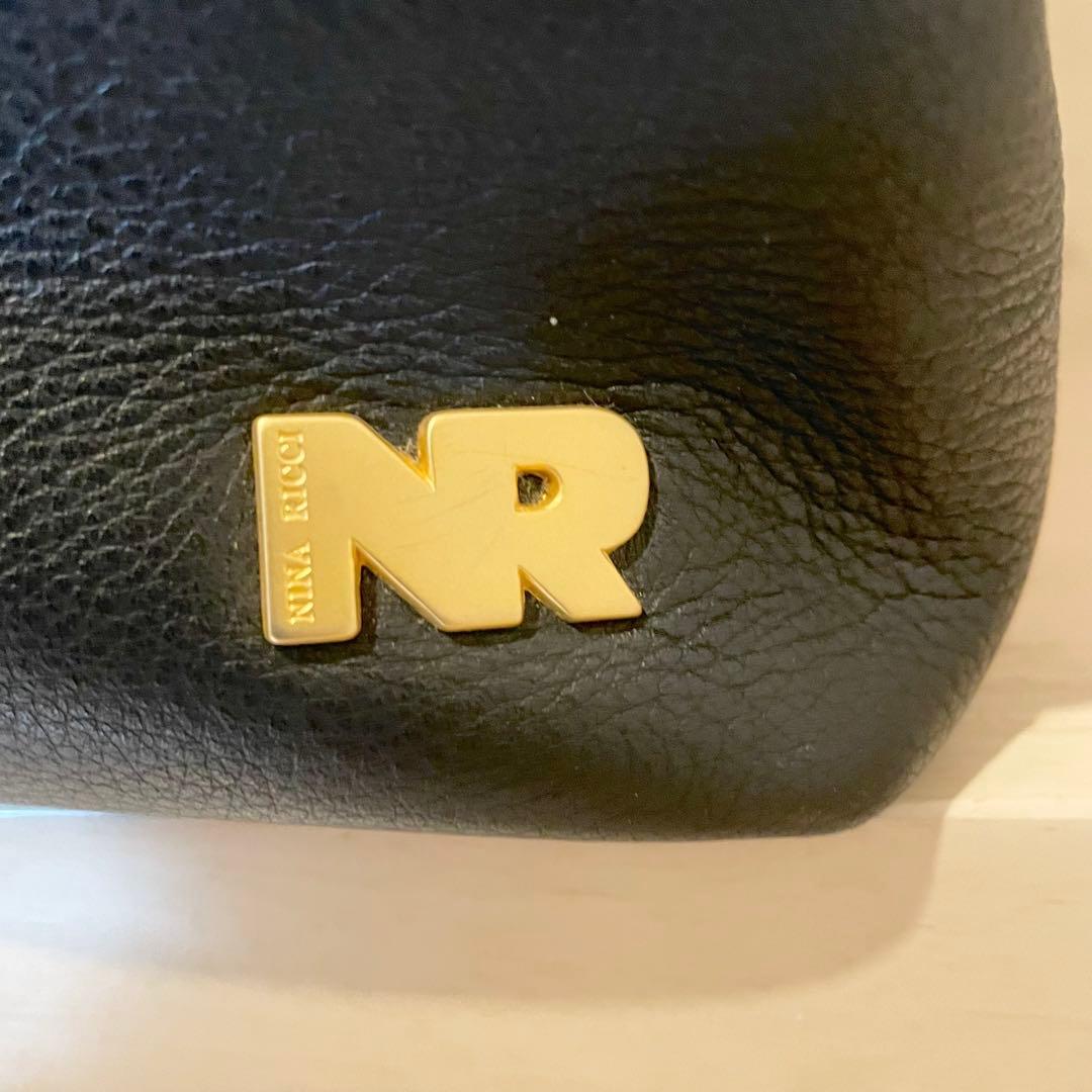 シンプルな黒のレザーショルダーバッグ、NRの金色ロゴ付き。