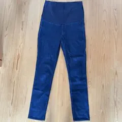 ダークブルーのマタニティスキニーパンツ、ハイウエストデザインで快適なフィット感。