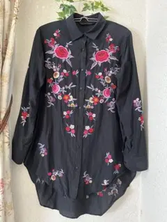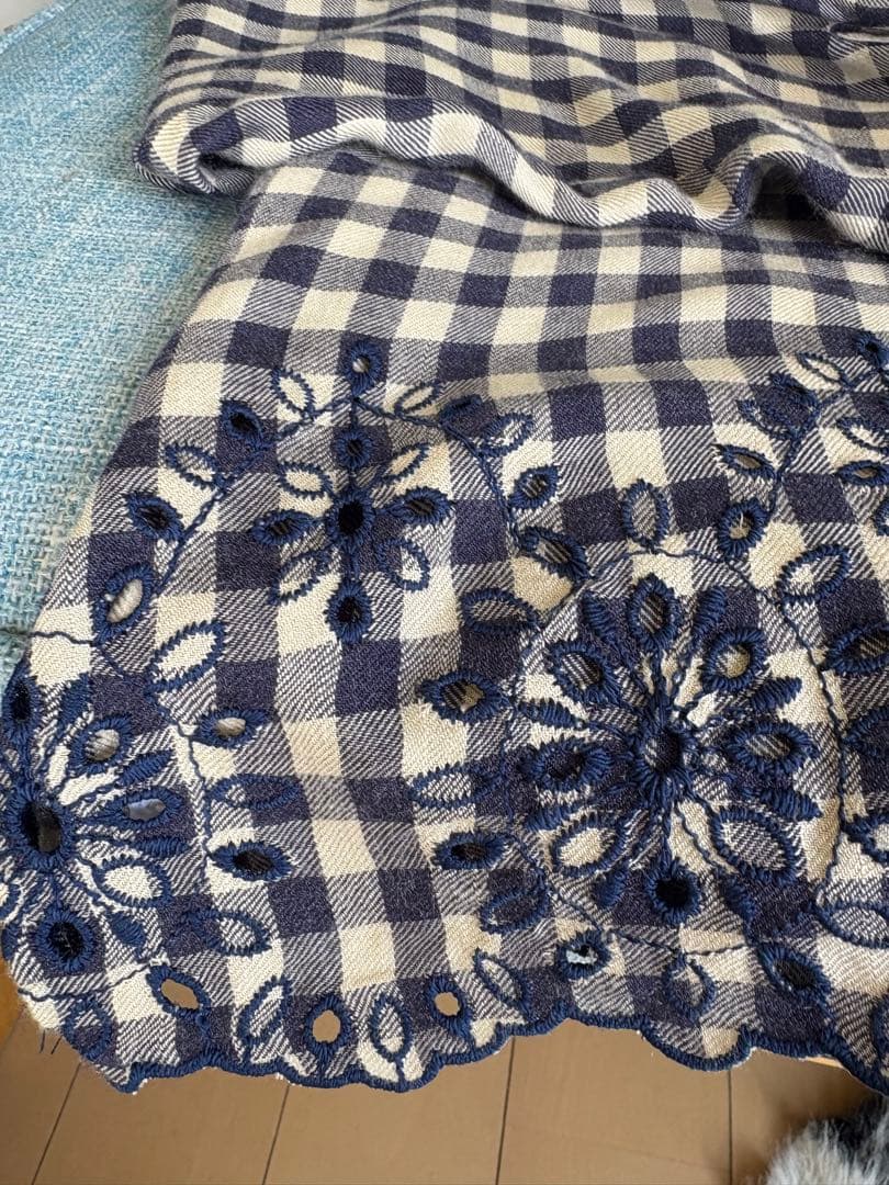 ネイビーとベージュのチェック柄に刺繍が施された長袖シャツ。