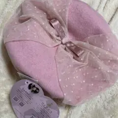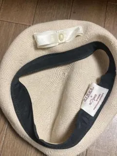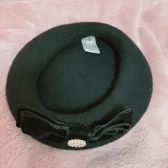 青木美沙子コラボ、グレーのウール製ベレー帽、パール付きリボンデザイン。