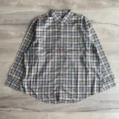ブルックスブラザーズの長袖ラガーシャツになります。紺色に黒色と茶色のマルチボーダー柄で、左胸部にGFマークが刺繍されております。